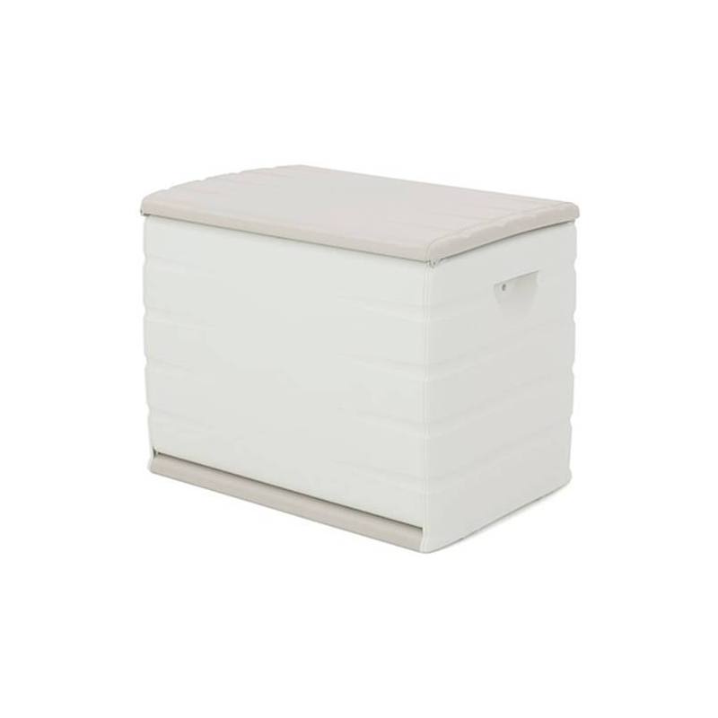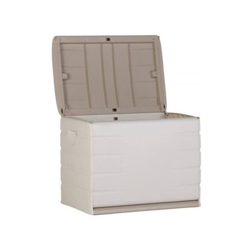 Los paneles laterales del baúl tienen conformado en el plástico unos asideros para poder transportar el baúl entre dos personas con facilidad. La tapa superior es basculante y permite abrirla completamente sin que se caiga hacia atrás ya que consta de unos tirantes de sujeción que la unen al baúl.