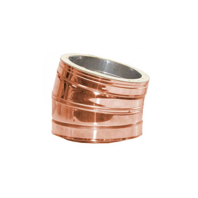 Este accesorio permite conducir la instalación en un ángulo de 15º. Está acabado en acero inoxidable y aislado con lana de roca, la parte exterior del codo se encuentra fabricada en cobre.