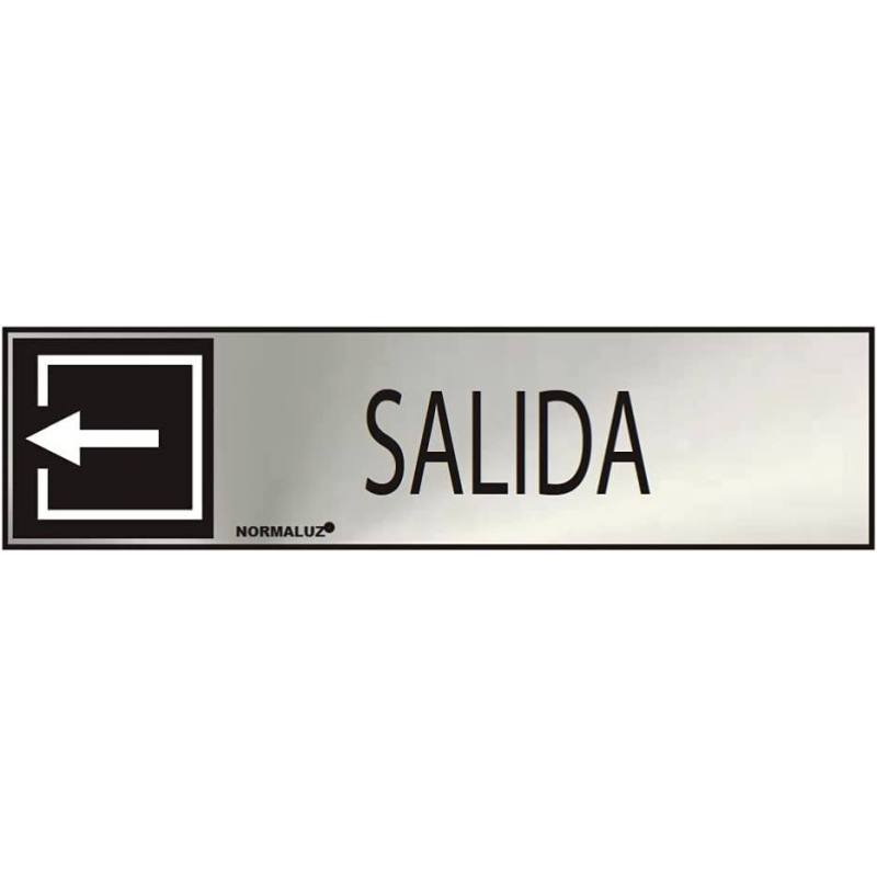Señal realizada en inoxidable con icono y texto indicadores de salida, con placa adhesiva, en formato horizontal de 5 x 20 centímetros.