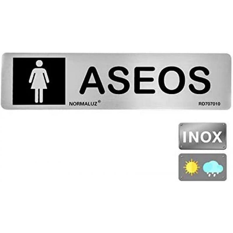 Señal Normaluz realizada en inoxidable con placa adhesiva, incluye texto e icono indicadores de aseo de señoras, tamaño de 5 x 20 centímetros.