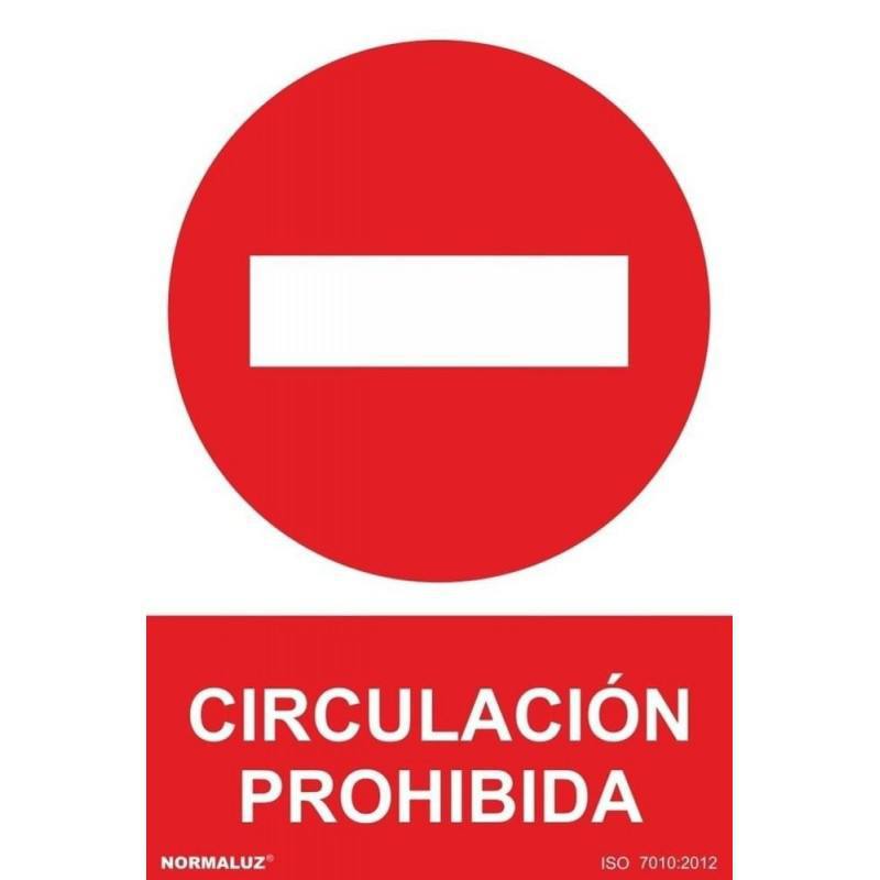 Señal de PVC para indicación vial o señalización de obra con icono y mensaje "Circulación prohibida", en colores rojo y blanco, con formato vertical de 21 x 30 centímetros.