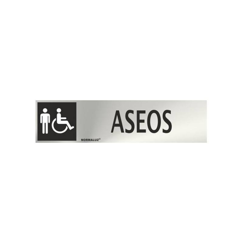 Señal realizada en inoxidable para indicación de aseos con icono masculino y minusválido, en formato horizontal de 20 x 50 centímetros.