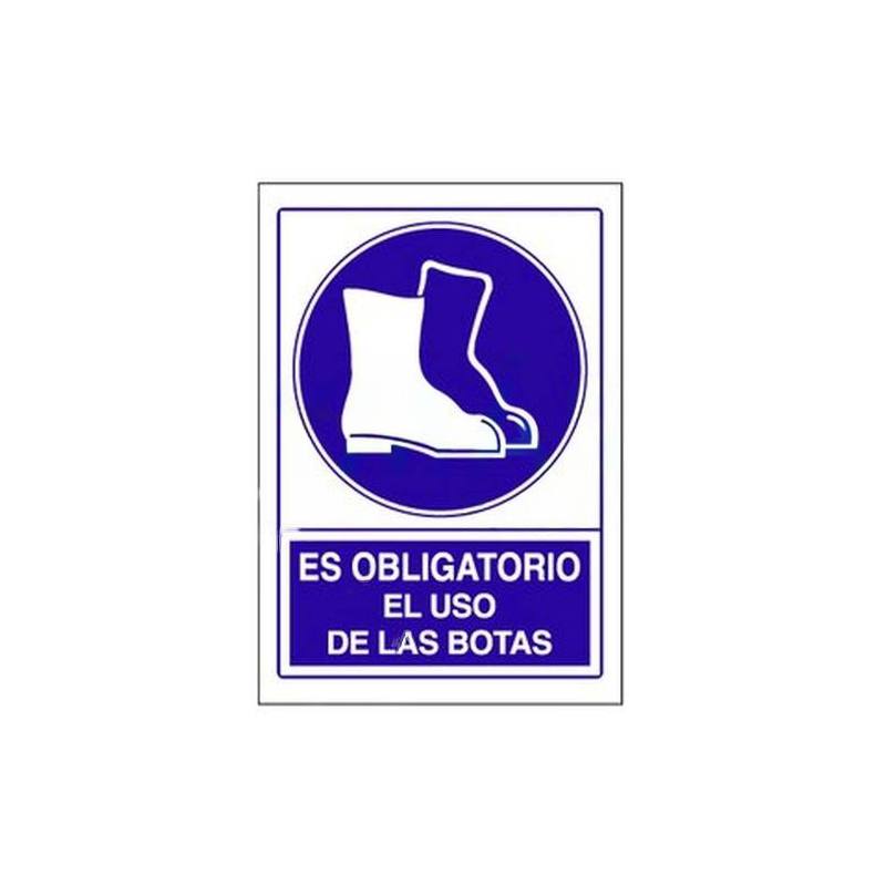 Señal de PVC para indicación vial o señalización de obra con icono y mensaje "Uso obligatorio de botas", en colores azul y blanco, con formato vertical de 21 x 30 centímetros.