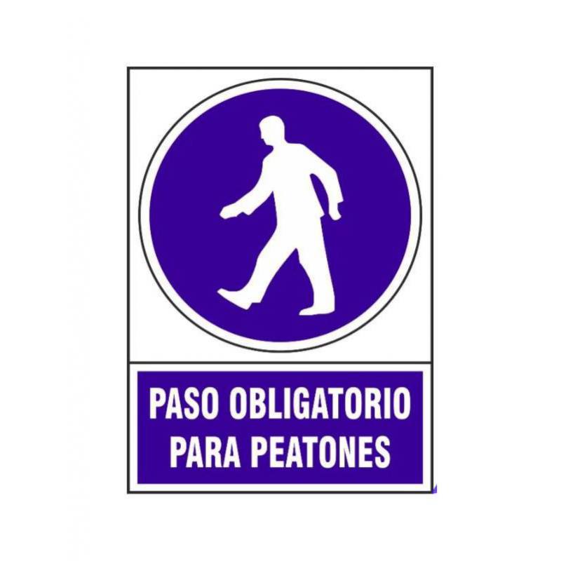 Señal de PVC para indicación vial o señalización de obra con icono y mensaje "Paso obligatorio de peatones", en colores azul y blanco, con formato vertical de 30 x 45 centímetros.