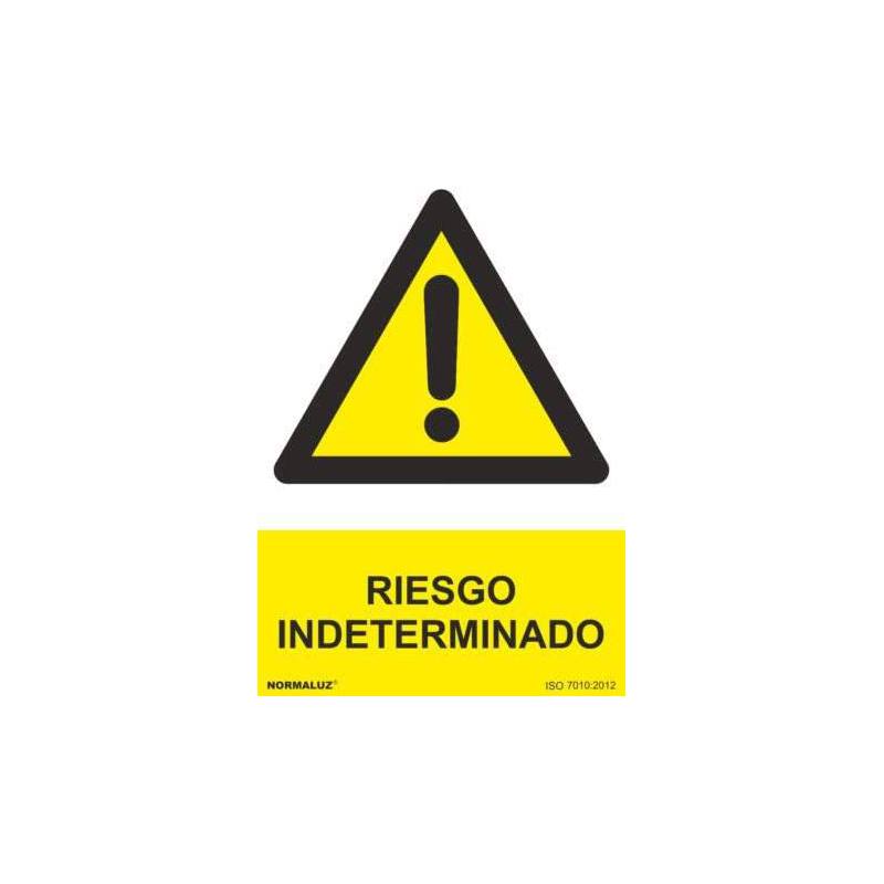 Señal de Riesgo indeterminado realizada en PVC en colores amarillo y negro, dimensiones de 21 x 30 cm.