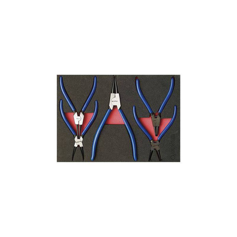 Pack de 5 alicates Seeger para arandelas de retención presentados en una bandeja de espuma de polietileno para un carro de herramientas.