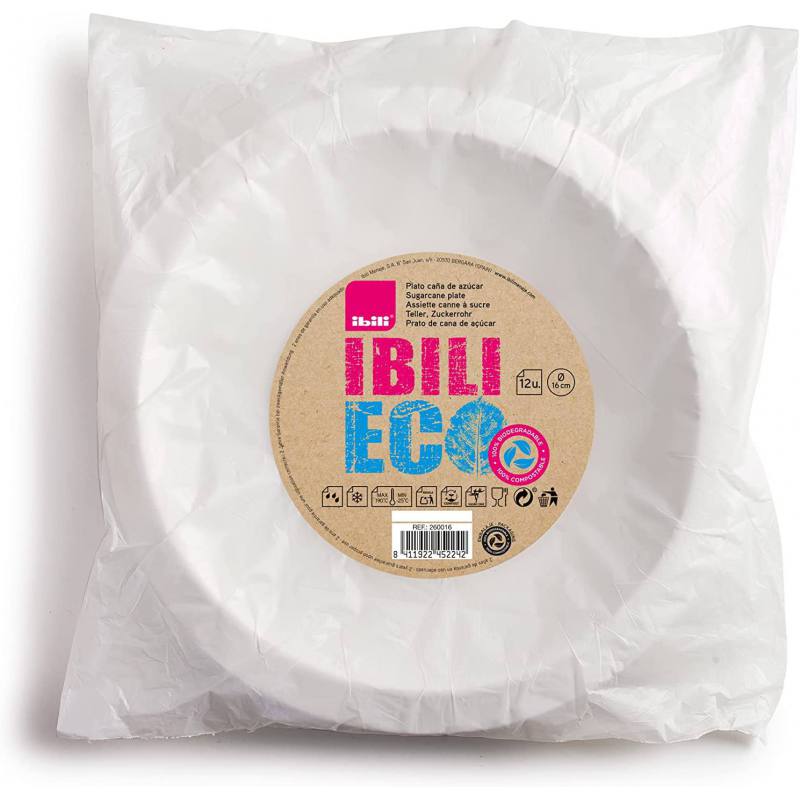 Juego de platos desechables ecológicos de Ibili, fabricados a base de caña de azúcar. Las dimensiones de los platos son 16 x 16 x 2 centímetros. Incluye 12 unidades con un diámetro de 16 cm.