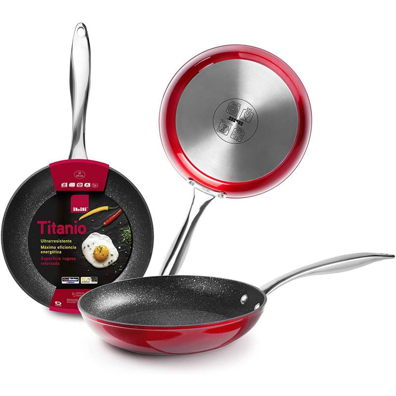 Sartenes de aluminio forjado con mango metálico de acero inoxidable. Superficie antiadherente. Libre de PFOA full induction. Marca Ibili.