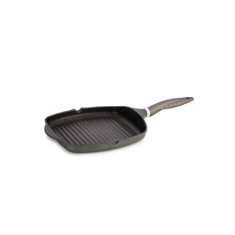 Grill modelo Tecnoform Platinum con superficie lisa y cuadrada de 26 x 26 centímetros fabricado en aluminio fundido, indicado para vitrocerámica.