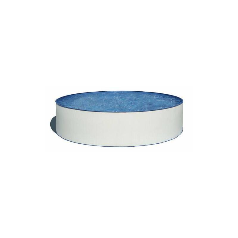 Piscina redonda de acero blanco lacado con estructura de chapa. Pertenece a la serie Lanzarote, con 90cm de profundidad y una capacidad para 7.693 litros.