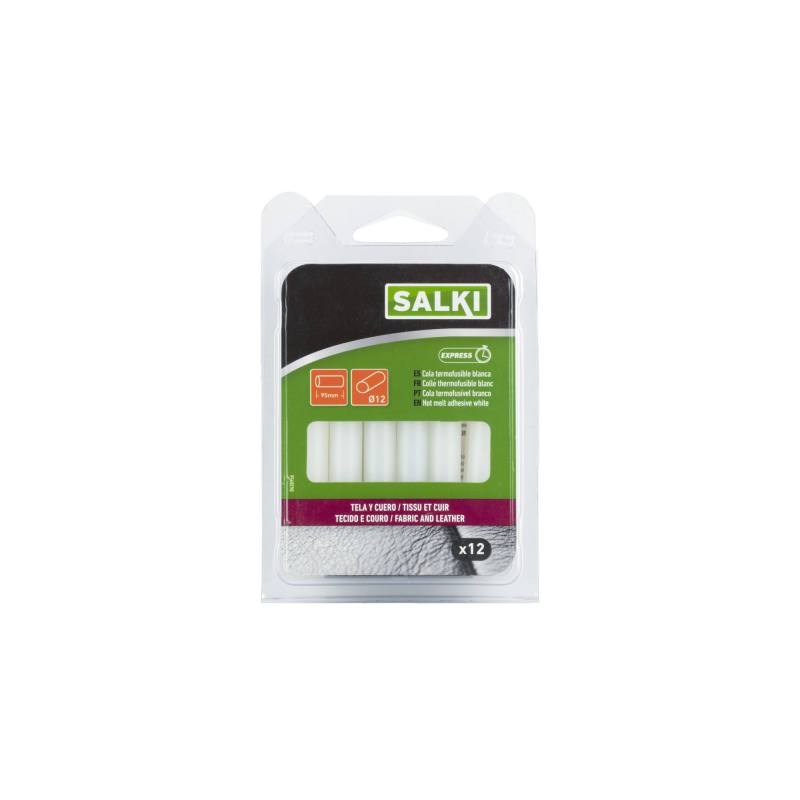 Cola adhesiva termofusible Salki especialmente diseñada para su aplicación en tela o cuero y otros materiales. Pack de 12 piezas de 11,5 mm.