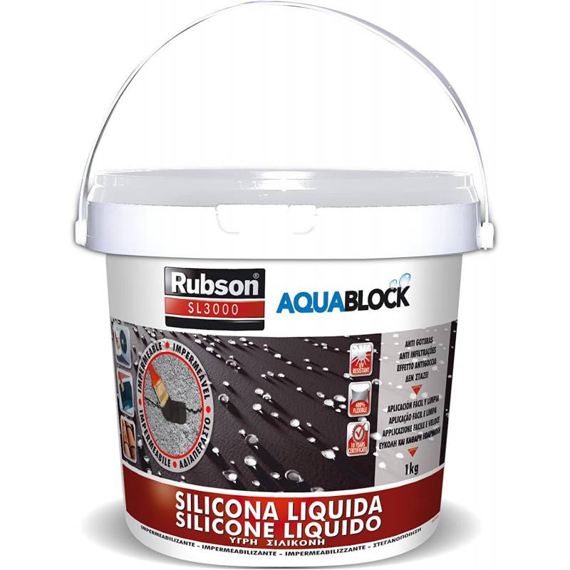 Silicona líquida Rubson Aquablock en color rojo teja, formato de 1 Kg.