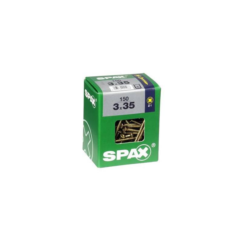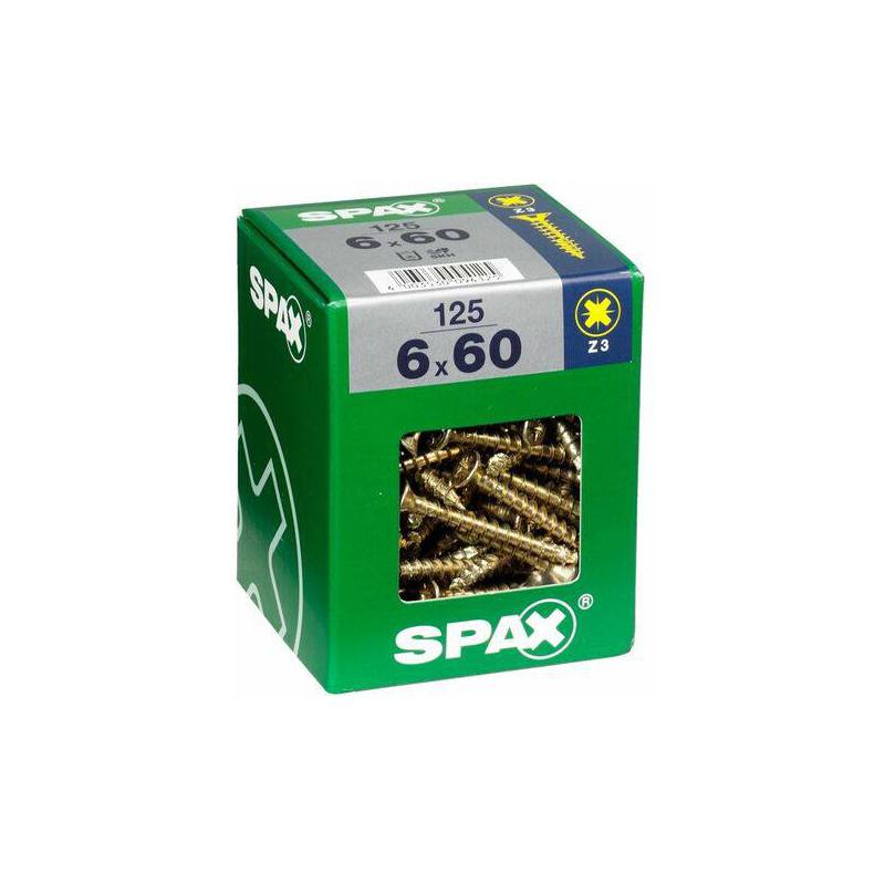 Tornillo para madera con punta Spax-S caracterizada por la presencia de un perfil ondulado en los flancos delanteros de la rosca. Caja de tornillos bricomatados con cabeza plana disponibles en diferentes medidas.