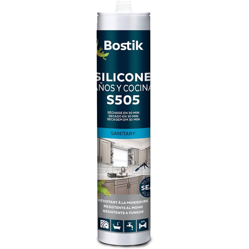 Silicona rápida antimoho especial para baños y cocinas de la marca Bostik, modelo S505 en color transparente, formato de 280 ml.